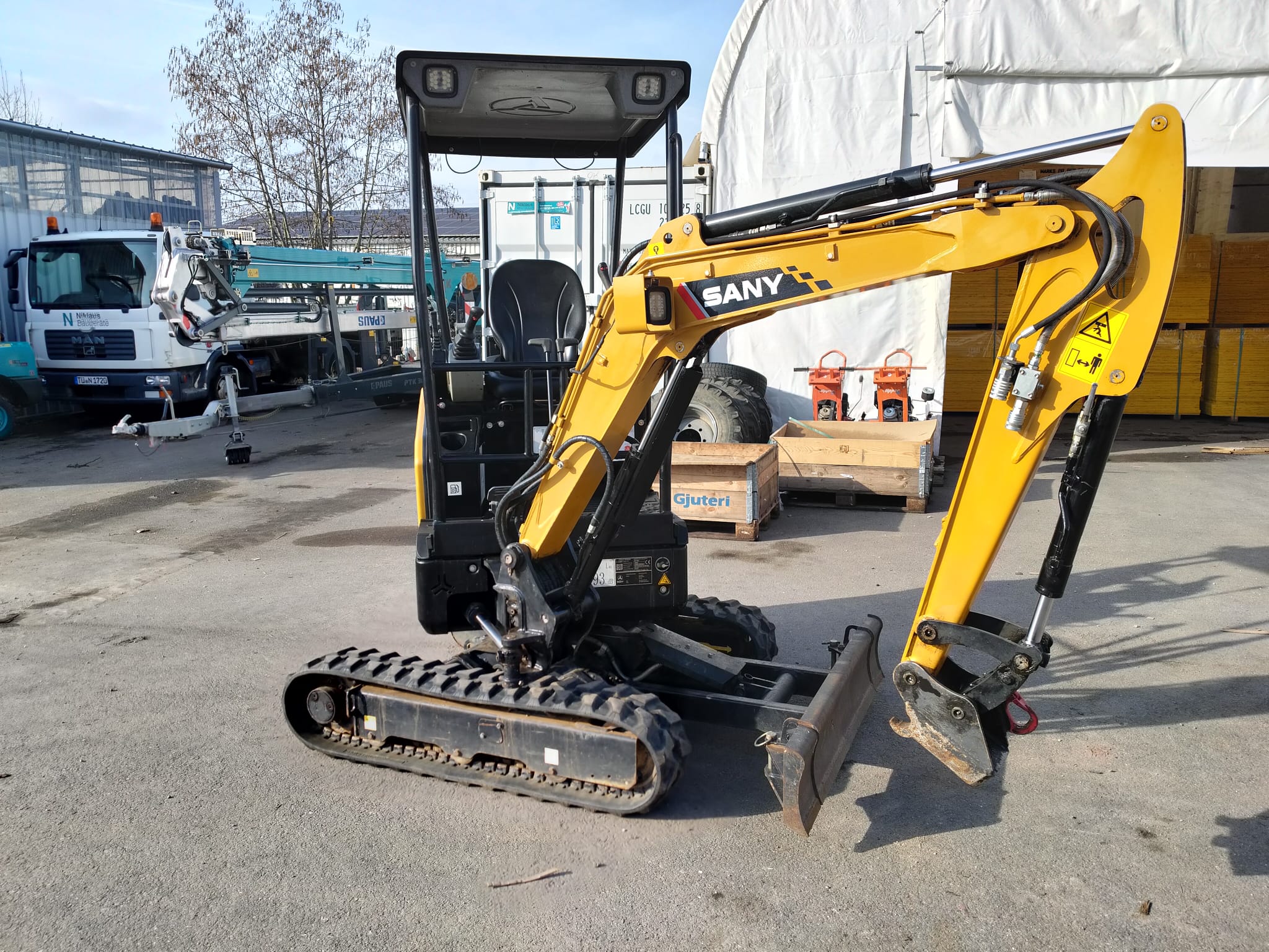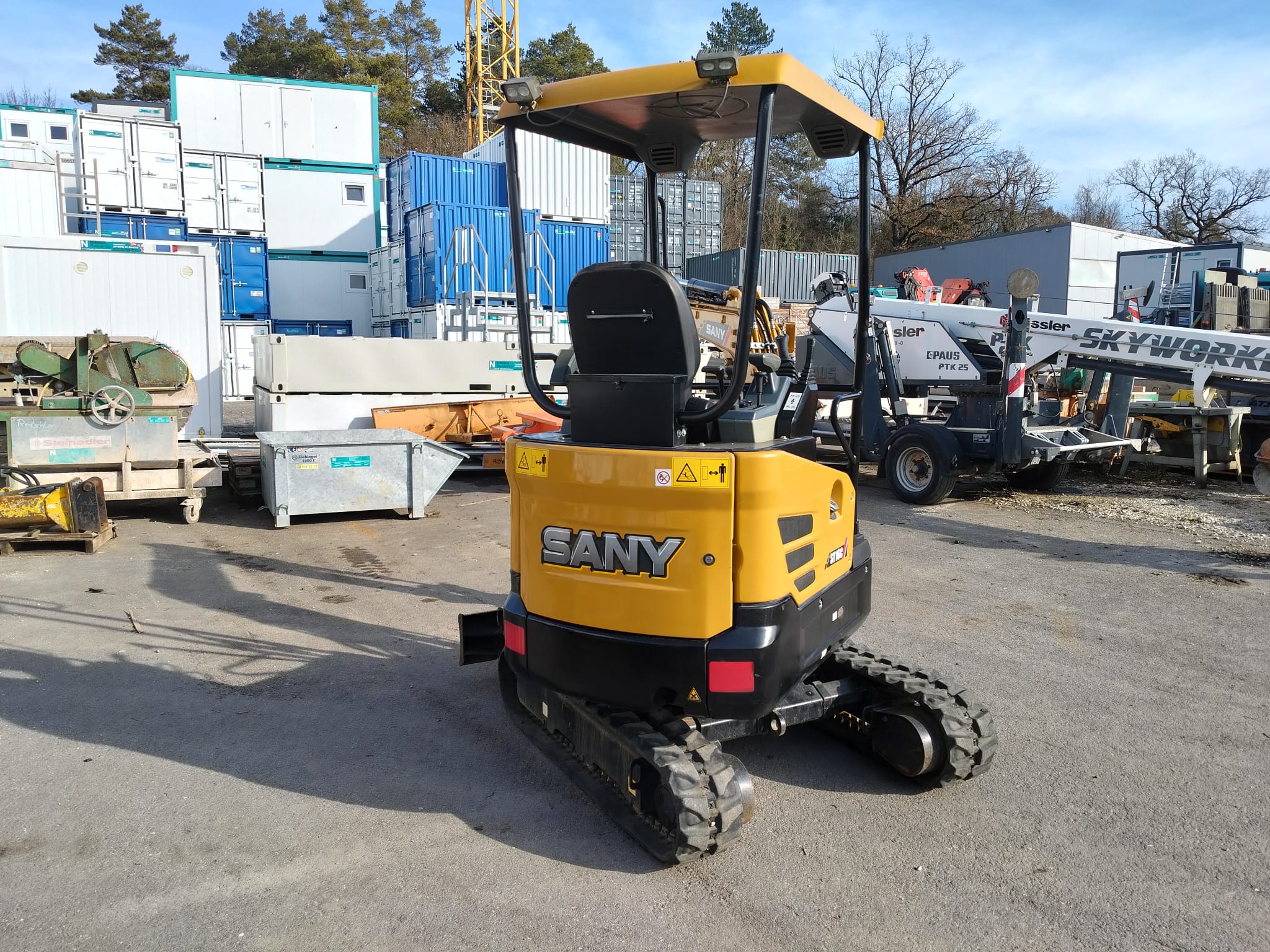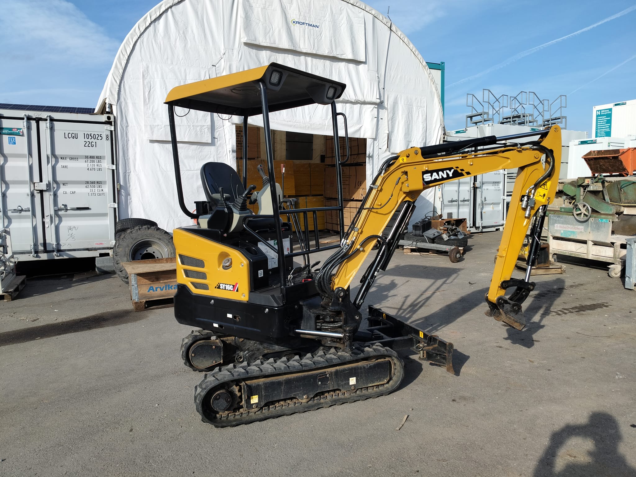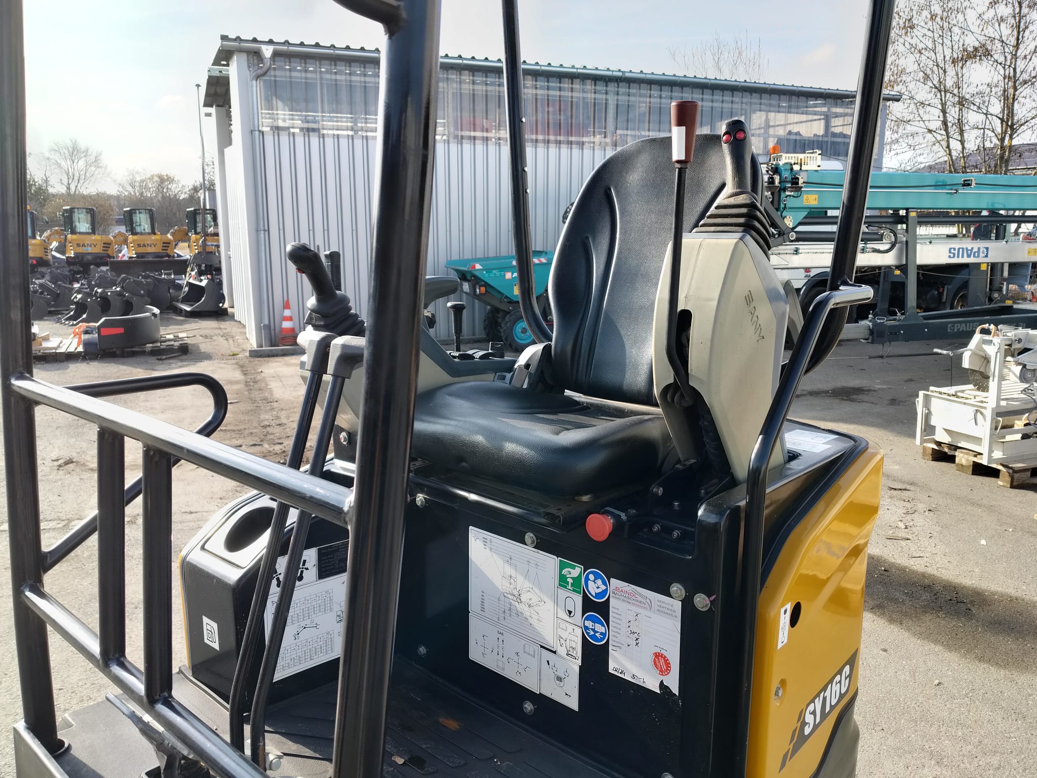 Der Sany SY 16C ist baugleich zum SY18C, aber mit Schutzdach statt Kabine. Entsprechend ist der SY 16C ebenfalls vollausgestattet (Kolbenverstellpumpe, elektrisch proportionale Vorsteuer für AUX1, LED Scheinwerfer, usw.)